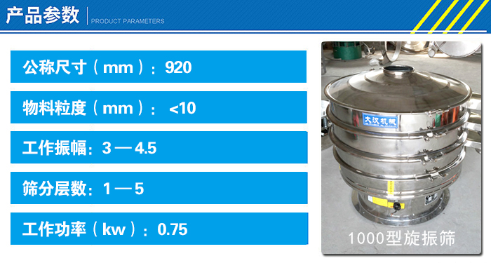 1000型不銹鋼振動篩整機采用不銹鋼304材質,篩面直徑920mm,網孔規格在0.028—5mm之間,搭配功率0.75KW的振動電機電機,日篩分花椒粉產量可達500kg-800kg。具體參數如下:
