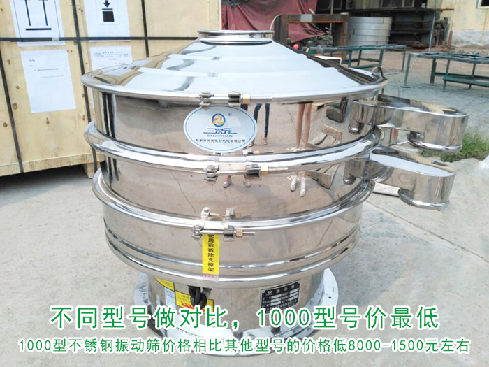 在滿足時篩500KG的花椒粉的前提下小編針對不同型號相同層數的振動篩設備作對比,1000型不銹鋼振動篩價格相比其他型號的價格低8000-1500元左右。