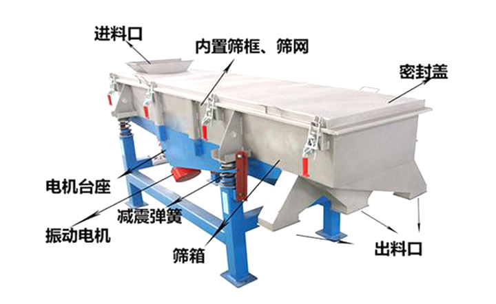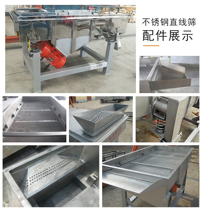 不銹鋼直線振動篩由篩箱、篩框、篩網、振動電機、電機臺座、減振彈簧、支架等組成。