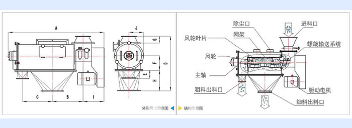 淀粉臥式氣旋篩由進料口、除塵口、網籠、螺旋輸送系統、風輪葉片、風輪、主軸、驅動電機、粗料出料口、細料出料口組成。