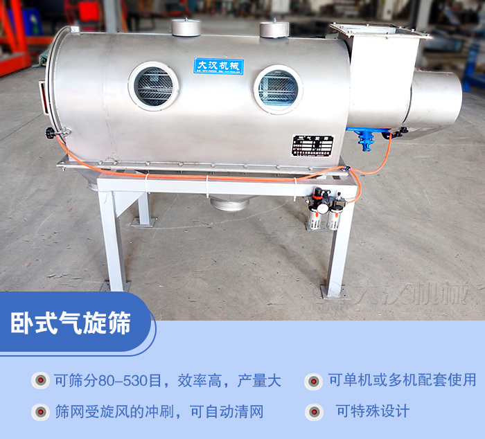 淀粉臥式氣旋篩可對細度范圍在80-500目內的粉狀物料很好的連續篩分,篩網可任意更換,材質上分為不銹鋼材質與碳鋼材質兩種,通過在密閉狀態下利用高速氣流作載體,使充分擴散的粉料微粒以足夠大的動能向篩網噴射,達到分級目的。特別適合篩分處理輕比重、粘度大、纖維多、有靜電、易團聚的微粉和特殊物料。