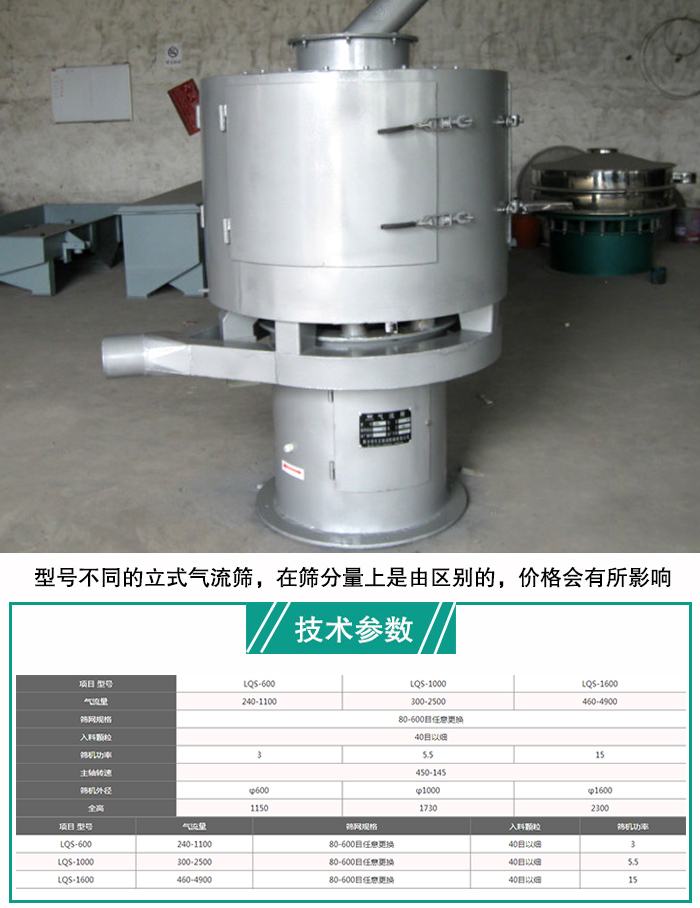 型號不同的立式氣流篩,在篩分量上是由區(qū)別的,價格會有所影響。大漢立式氣流篩型號有LQS-600型、LQS-1000型、LQS-1600型等,不同型號的立式氣流篩,其氣流量、電機功率、篩機外徑等都是不同的,所以價格自然也是不同的。