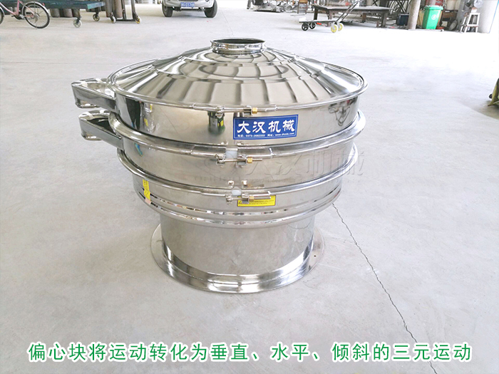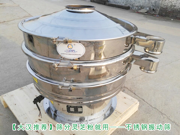 大漢機械生產的不銹鋼振動篩利用振動電機作為激振源,使靈芝粉在篩面上被拋起落下,通過不同層數的篩網目數產生數種規格的篩上物和篩下物,分別從各自的出口排出,以達到靈芝粉篩分除雜的目的。